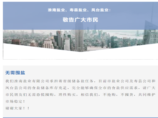 為有效阻止食鹽搶購風(fēng)波蔓延,全省各級(jí)鹽業(yè)公司一方面充分利用微信公眾號(hào)、地方性媒體、微信朋友圈等線上渠道發(fā)布正面宣傳信息,另一方面積極組織人員進(jìn)商超、下市場(chǎng),通過面對(duì)面的宣傳形式,引導(dǎo)廣大消費(fèi)者不搶購、不囤貨、理性購鹽。