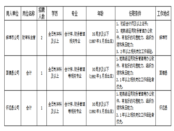 1、市公司財審主管:男女不限,全日制本科及以上學歷,年齡35周歲及以下,會計學、財務管理相關專業;初級會計師及以上證書,熟練運用財務管理辦公軟件,有良好的溝通能力、組織協調和承壓能力;2年以上相關崗位工作經驗。
